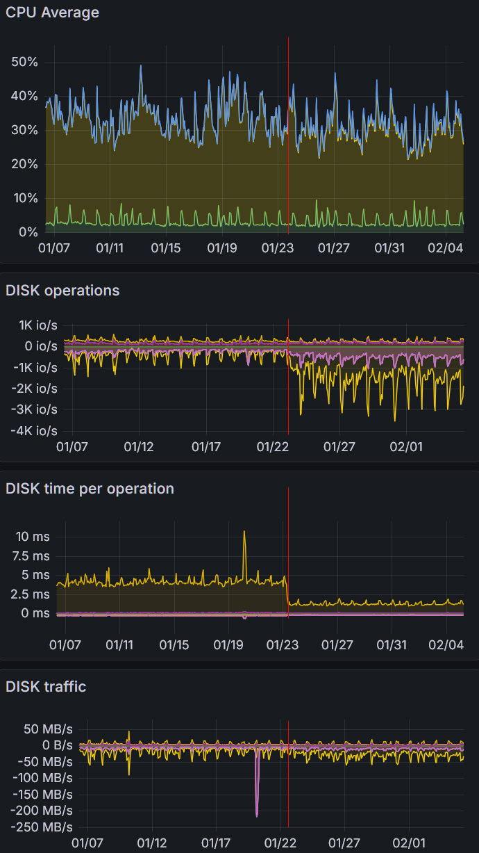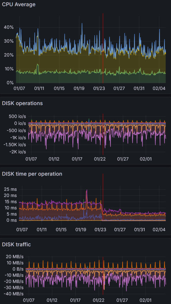 Drop in disk time means, that doing direct reading is faster, than doing it through cache , which in my opinion indicates, that host RAM is slow. And indeed – host is a desktop-like server with just DualChannel memory, which can be filled up with data and operations quite quickly. And therefore we have switched our servers to use no cache for disks and free up memory for real CPU intensive tasks.